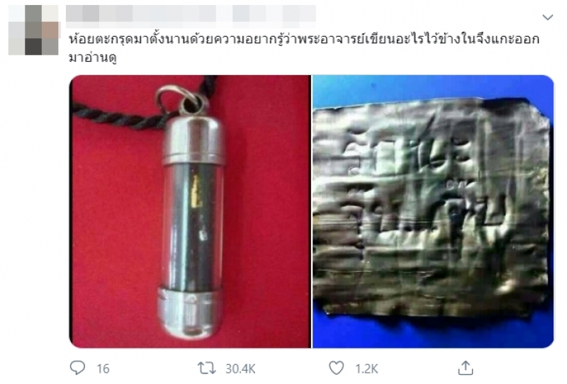 ผู้ใช้ทวิตเตอร์โพสต์ข้อความระบุว่า ห้อยตะกรุดมาตั้งนานด้วยความอยากรู้ว่าพระอาจารย์เขียนอะไรไว้ข้างในจึงแกะออกมาอ่านดู